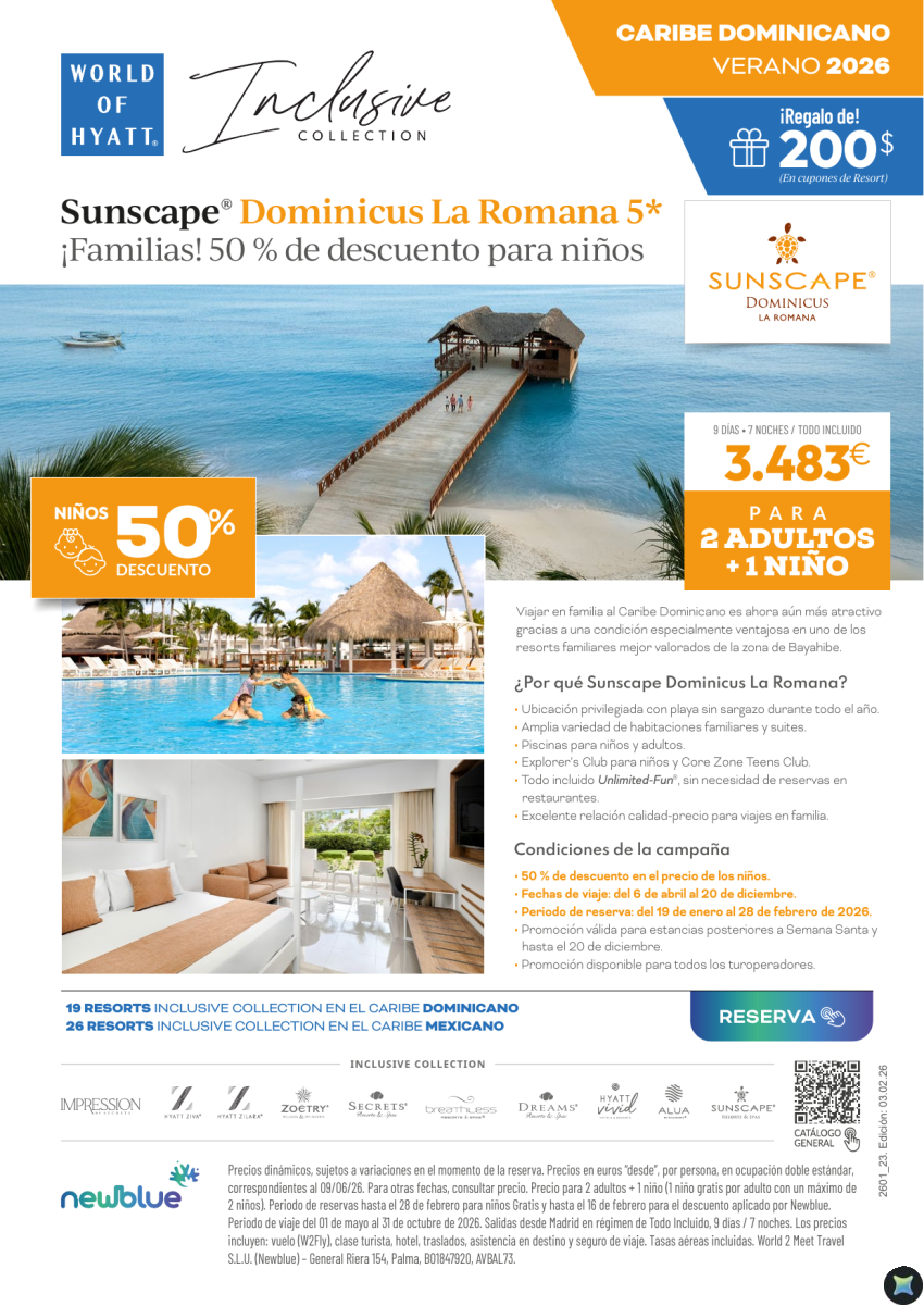 50% Dto. Sunscape Dominicus - Verano SIN Sargazo - 2 Adultos + 1 Niño: 3.328€
