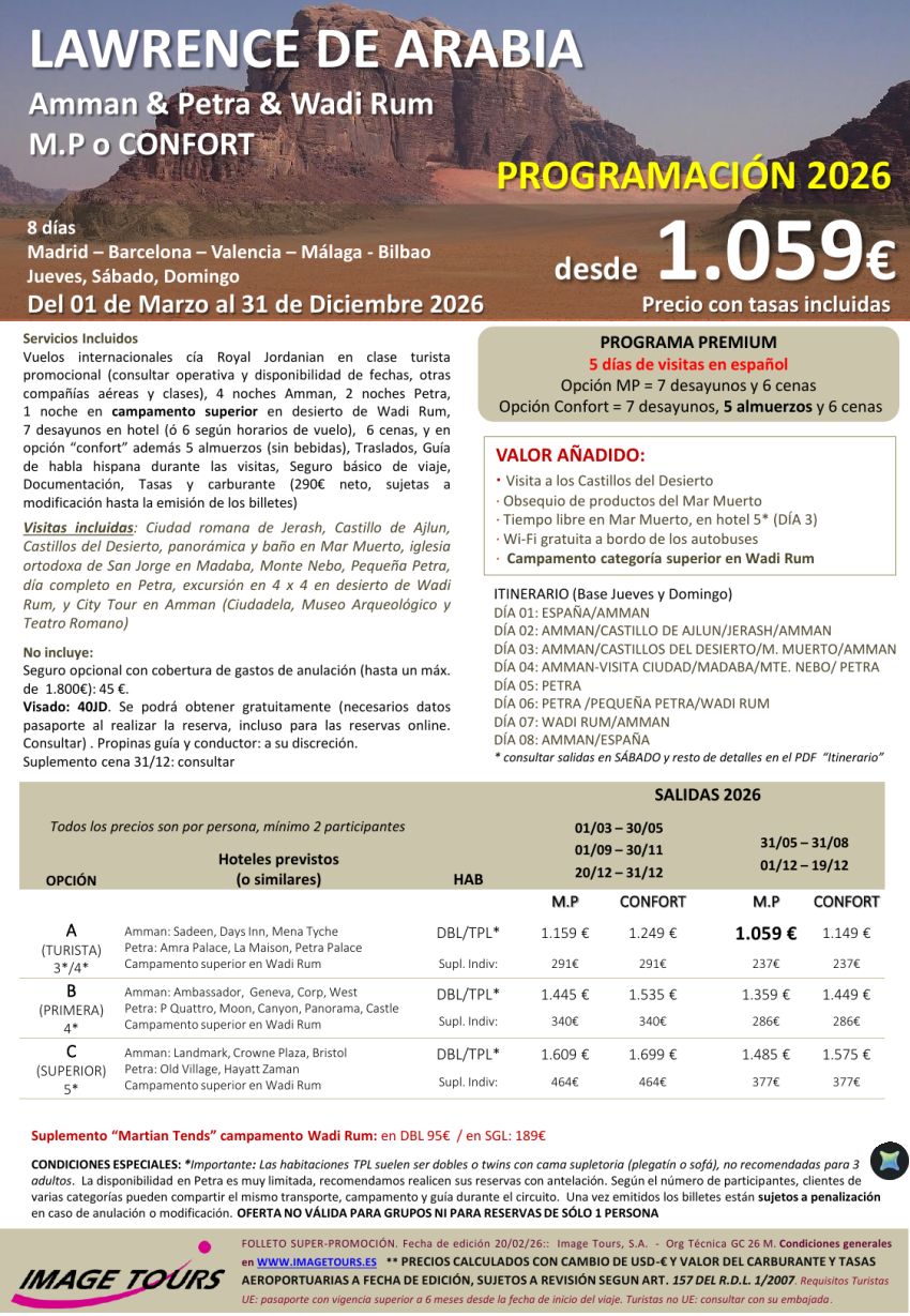 JORDANIA *Circuito 8 días Premium* Lawrence de Arabia, con campamento superior en Wadi Rum, desde 1.059€